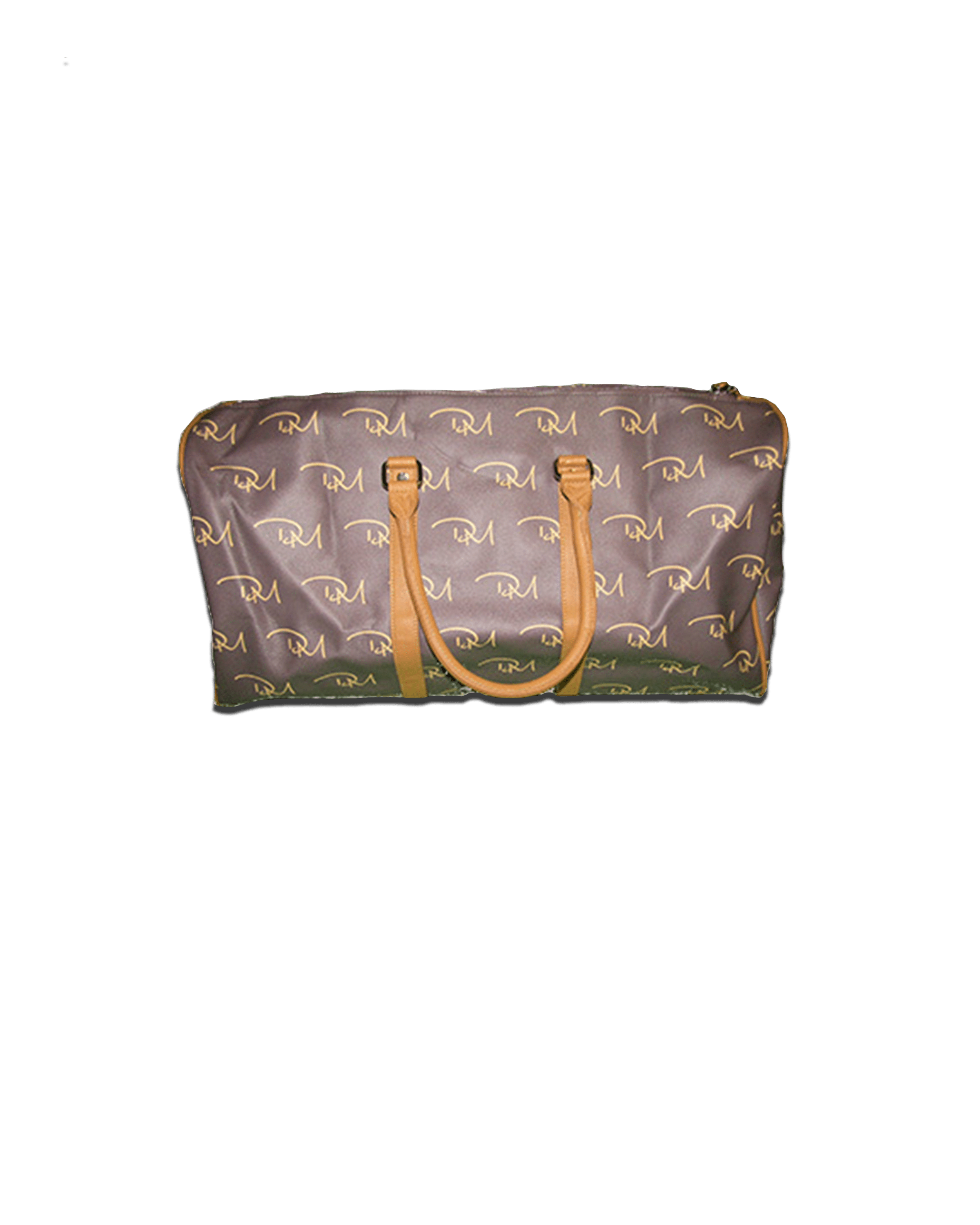 A lightweight brown leather duffle bag with the Dennis Matthew logo print. The double-pull zipper adds a large opening for easy access. Featuring a minimalist design with a large storage area perfect for weekend trips!