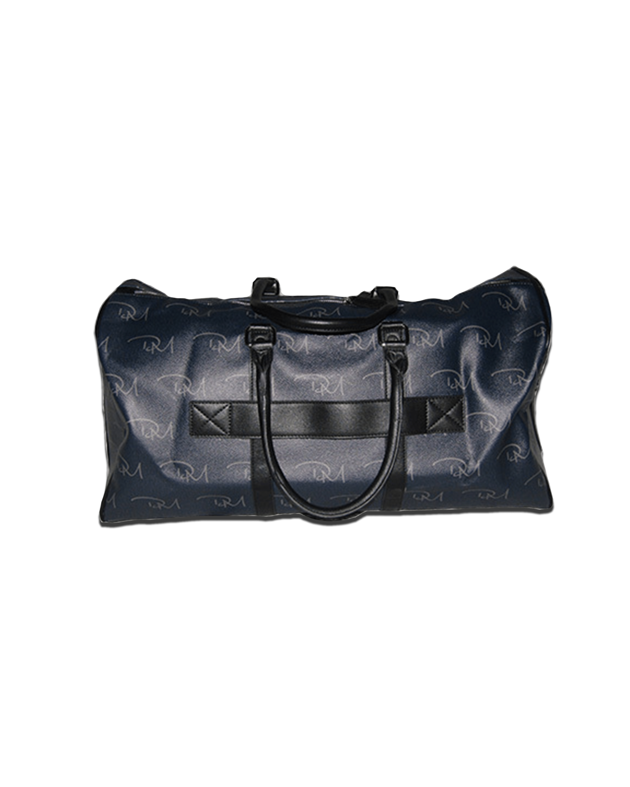 A lightweight navy blue leather duffle bag with the Dennis Matthew logo print. The double-pull zipper adds a large opening for easy access. Featuring a minimalist design with a large storage area perfect for weekend trips!