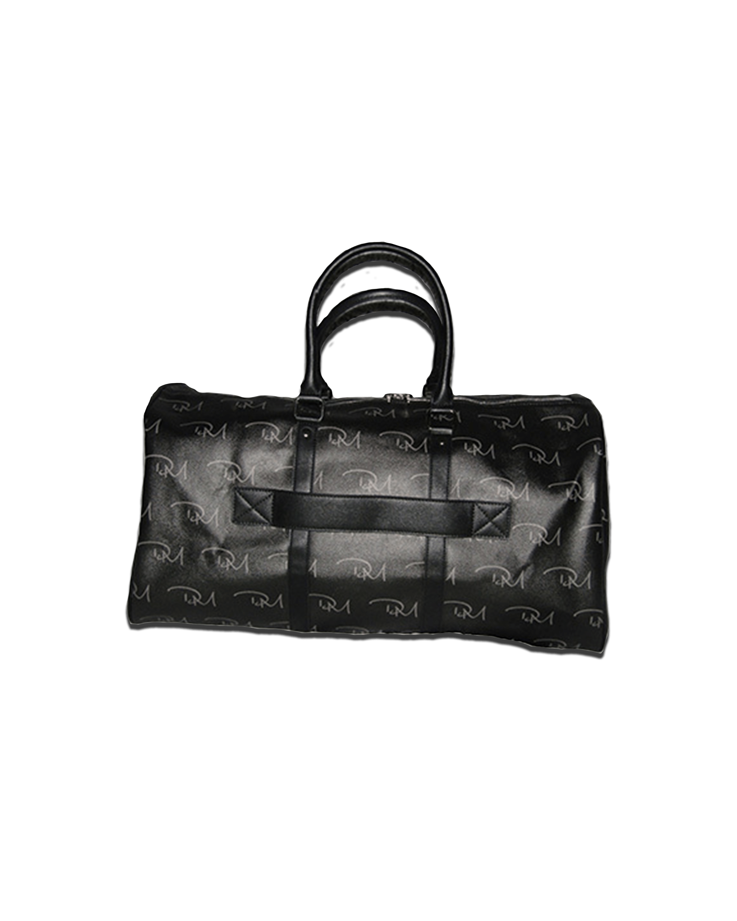 A lightweight black leather duffle bag with the Dennis Matthew logo print. The double-pull zipper adds a large opening for easy access. Featuring a minimalist design with a large storage area perfect for weekend trips!